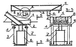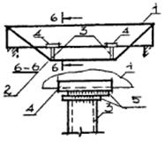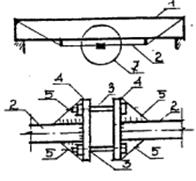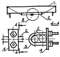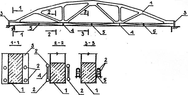 Рис.4. Установка предварительно напряженной затяжки из арматурной стали на нижний пояс. 1 – усиливаемая ферма; 2 – затяжка из предварительно напряженной арматуры диаметром 25 – 40 мм класса А- III; 3 – торцевой упорный лист; 4 – распорка; 5 – стяжной хомут.