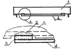 1- усиливаемая конструкция; 2 – оголенная арматура; 3 – арматурные коротыши, приваренные к оголенной арматуре; 4 – затяжка усиления из арматурной стали, нагретая до 350-400 0 С и приваренная к арматурным коротышам.