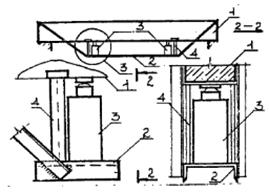 1 – усиливаемая конструкция; 2 – шпренгельная затяжка (горизонтальный участок из швеллера, наклонные – из уголка); 3 – гидродомкрат; 4 – распорка из швеллера (установить после натяжения затяжки).