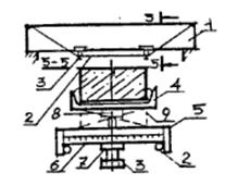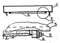 1 – усиливаемая конструкция; 2 – шпренгельная затяжка; 3 – подвесная конструкция для установки гидродомкратов; 4 – крепежные болты; 5 – опорный швеллер для крепления подвесной конструкции (приварен к затяжке); 6 – гидродомкрат; 7 – шток поршня гидродомкрата (в затяжке у швеллера устраивается отверстие для штока); 8 – листовые прокладки – упоры.