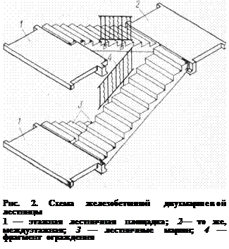 Лестницы состоят из площадок, маршей и ограждений. По числу маршей на этаже лестницы бывают одномаршевые, двухмаршевые, трехмаршевые (рис.1,а — в). В современных зданиях применяют в основном двухмаршевые лестницы (рис. 2). Лестничные площадки, устанавливаемые горизонтально на уровне пола этажа, называются этажными, а те, что стоят между этажами,— междуэтажными. Лестничные марши устраивают наклонно. Уклон определяется отношением высоты марша к его горизонтальной проекции и считается удобным, если это отношение составляет от 1:1,5 до 1:2.