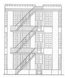 В многоэтажных зданиях устраивают наружные металлические пожарные лестницы для эвакуации людей в случае пожара. Они должны сообщаться с помещениями через площадки или балконы на уровне эвакуационных выходов и иметь ограждения высотой 800 мм. Угол наклона лестниц должен быть не более 45°, а ширина — не менее 0,7 м.