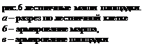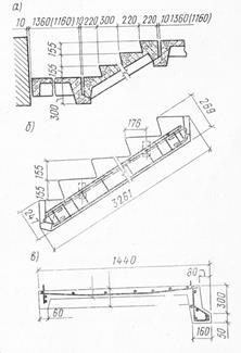 Лестничные площадки состоят из ребер и плиты. Ребра лестничных площадок армируют сварными каркасами с рабочей арматурой из стали класса A-III. Плиту площадки армируют сеткой из холоднотянутой проволоки. Иногда лестницы монтируют из мелких элементов — подкосоурных балок, косоуров, отдельных ступеней. Такие лестницы неиндустриальны и неэкономичны. Примеры армирования лестничного марша и лестничной площадки показаны на рис. 6 б, в