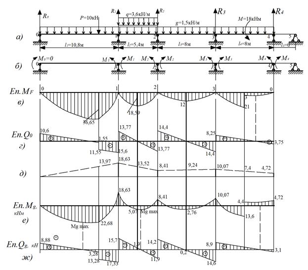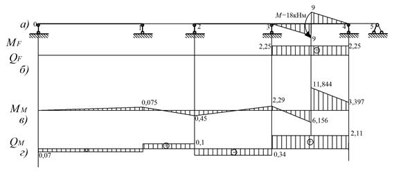 епюра від зовнішнього навантаження в прогонах, як окремих однопрогонових балках (рис.2г).