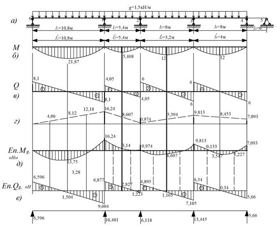 Складуємо епюру від зовнішнього навантаження в прогонах балки (рис.2в) з огібной епюрою моментів (рис.2д) і будуємо епюру