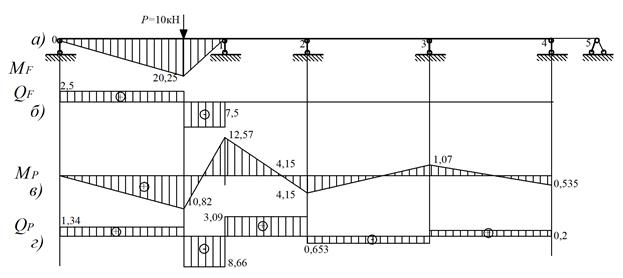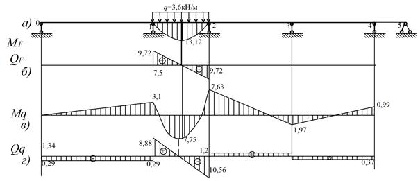 Для визначення фіктивних опорних реакцій необхідно побудувати епюри від зовнішнього навантаження в цих прогонах, як окремих однопрогонових балках (рис.2в).