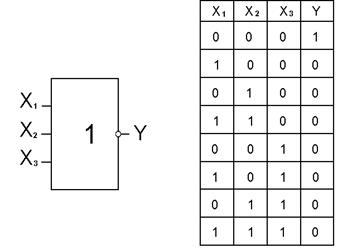 Логічні елементи, що реалізують операції кон’юнкції, диз’юнкції, функції Пірса і Шеффера, можуть бути, у загальному випадку, n - входові. Так, наприклад, логічний елемент із трьома входами, що реалізує функцію Пірса, має вид, представлений на рис.10.