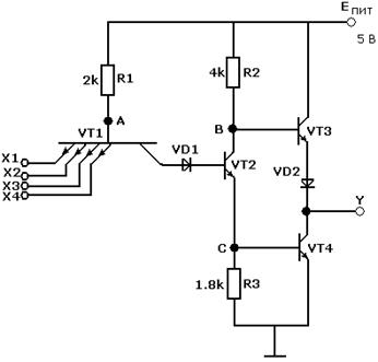 Если на все входы многоэмиттерного транзистора VT1 поданы напряжения логической ²1², то эмиттеры VT1 не получают открывающегося тока смещения (нет разности потенциалов). При этом ток, задаваемый в базу VT1 через резистор R1 , проходит от источника Eпит в цепь коллектора VT1 , смещенного в прямом направлении, через диод VD1 и далее в базу VT2 . Транзистор VT2 при этом находится в режиме насыщения (VT2 - открыт) в точке ² B ² Uб =0,2 В (уровень логического нуля). Далее ток попадает на базу VT4 и открывает VT4 на выходе схемы ²0².