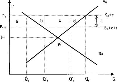 Рівновага попиту і пропозиції в умовах вільної торгівлі буде досягнута в точці (W), в якій обсяг пропозиції товару позначено Сд., а внутрішній попит —Qd . Надлишок товару, тобто різниця між обсягом пропозиції та внутрішнім попитом (Сд. —Q^), експортуватиметься на світовий ринок.