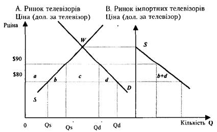 Чисті національні втрати від введення національного тарифу. Збитки, які завдаються державі, можна визначити й в інший спосіб. Права частина рис. відображає ринок імпортних телевізорів. Крива попиту на цьому ринку показує, на яку величину попит перевищує пропозицію за кожного рівня цін.