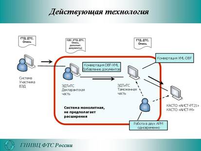 Применяемая в настоящее время технология обеспечивает подключение абонентского пункта брокера (декларанта) к ЕАИС и информационный обмен по выделенному каналу связи на уровне таможенного поста. Программные средства используются для проведения начального и заключительного этапов основного таможенного оформления должностными лицами структурных подразделений таможенного органа. [13]. Комплекс программных средств обработки сведений в электронной форме состоит из двух подсистем: подсистемы декларанта и подсистемы таможенного органа.