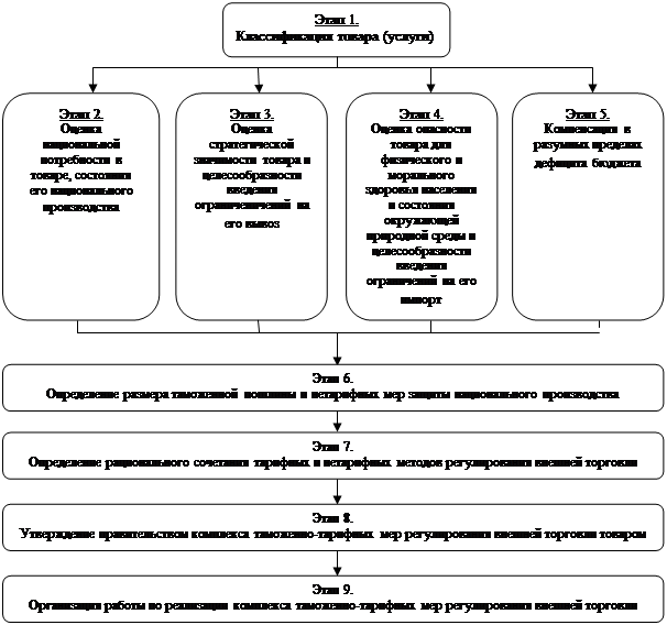Для решения данной проблемы необходимо определить алгоритм (последовательность) реализации государственной таможенной политики в отношении конкретных товарных групп, а затем разработать научно-обоснованные методы выработки решений по отдельным позициям алгоритма и в целом по проблеме. На рисунке 1 приведен один из возможных вариантов алгоритма реализации государственной таможенной политики в отношении конкретной товарной группы, который может быть взят за основу построения системы управления комплексом таможенно-тарифных мер регулирования внешней торговли по критерию качества результатов.