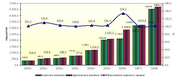 По данным статистики ФТС России за 2008 год в федеральный бюджет перечислено 4694,5 млрд. рублей, что составляет 101,8% от установленного таможенным органам задания. По сравнению с прошлым годом таможенных платежей перечислено на 1440,6 млрд. рублей больше или на 44,3%. (рис. 1).