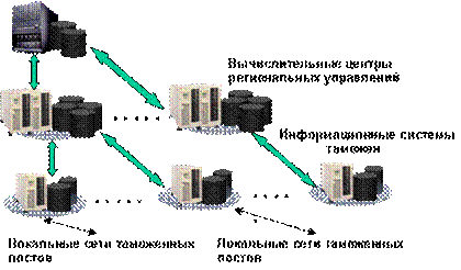 На верхнем уровне системы таможенных органов России находится ГНИВЦ. Комплекс его технических средств включает центральные ЭВМ и интеллектуальные терминалы, объединенные в единую вычислительную сеть, а также локальные вычислительные сети (ЛВС) некоторых функциональных управлений ФТС России и технологическую ЛВС ГНИВЦ.