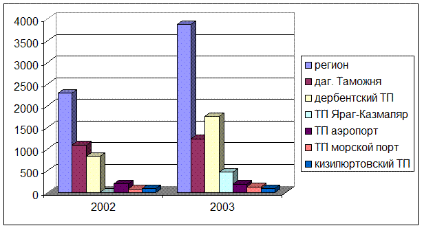 При таможенном оформлении товаров, ввозимых физическими лицами на таможенную территорию РФ согласно упрощенному порядку, в регионе деятельности Дагестанской таможни применяется устная форма декларирования. Декларирование товаров в устной форме осуществляется на таможенных постах «Яраг-Казмаляр», «Железнодорожный пункт пропуска Дербент», «Аэропорт Махачкала». В среднем за один месяц 2003г. через таможенный пост «Яраг-Казмаляр» было пропущено 23175 физических лиц продекларировавших свои товары в устной форме, через таможенный пост «ЖД ПП Дербент» – 8085 физических лиц, через таможенный пост «Аэропорт – Махачкала» 459 физических лиц (см. таб.3)[2]