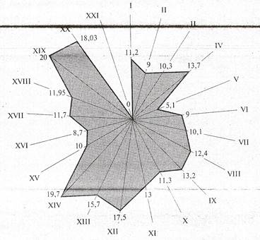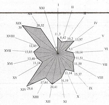 Рисунок 3 – Распределение адвалорных ставок импортного тарифа Российской Федерации за 2001 г. по разделам ТН ВЭД