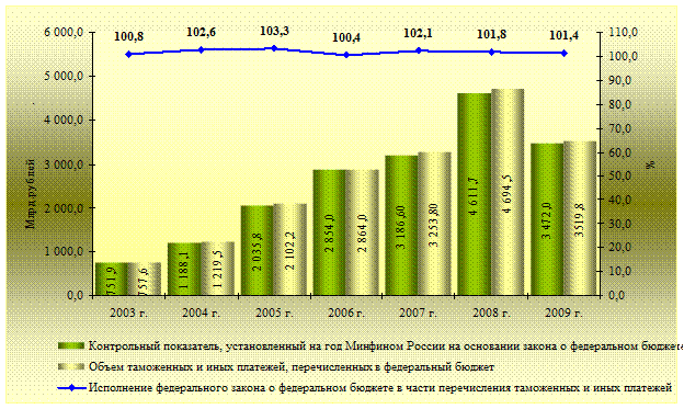 Несмотря на снижение объемов внешнеторгового оборота по сравнению с 2008 годом более чем на 36 %, перечисления ФТС России в федеральный бюджет превысили уровень докризисного 2007 года на 8 %. Контрольное задание на 2009 год выполнено на 101,4 %, при этом в федеральный бюджет было перечислено более 3 триллионов 519,8 миллиардов рублей (Диаграмма 1).