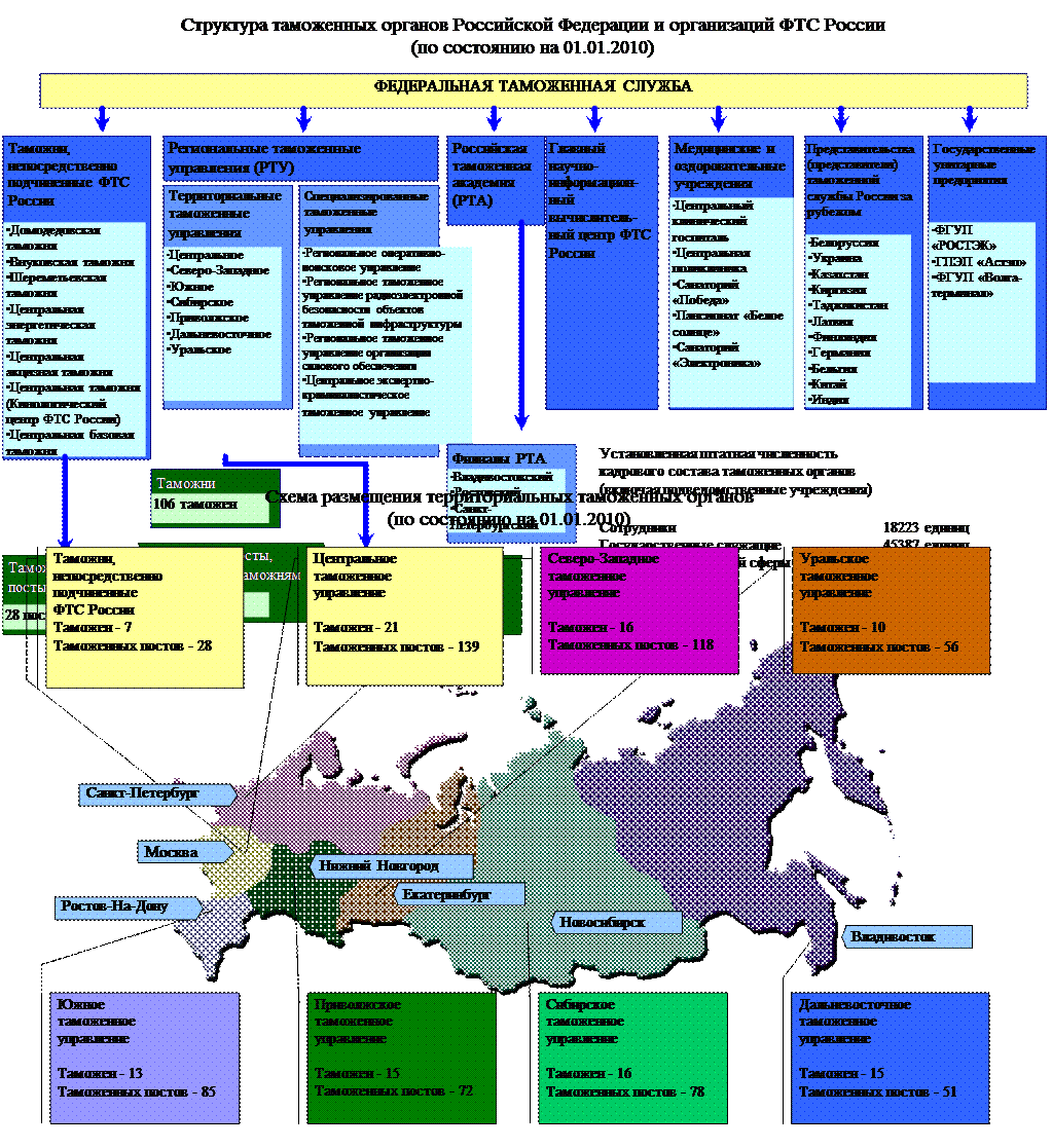 Исполнение функций ФТС России осуществляется через систему таможенных органов, в которую, по состоянию на 1 января 2008 года входят 7 региональных таможенных управлений, 4 специализированных региональных таможенных управления, 126 таможен, 690 таможенных постов, 8 учреждений, находящиеся в ведении ФТС России, 8 представительств ФТС России за рубежом. Общая численность таможенных органов составляет 73673 единицы.