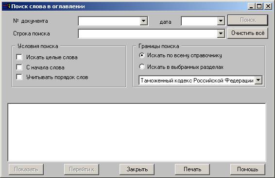б) инструментальный поиск. Предлагается использовать пункт меню "Поиск", "Искать код товара в ТН ВЭД…". В открывшемся окне введите первые цифры кода товара и нажмите <OK>. Также существует возможность поиска интересующих Вас товаров и ассоциированных с ними документов по номеру документа, по дате его создания, по ключевому слову. Наряду с поиском по всему справочнику возможен выбор какого-нибудь определенного раздела (см. рисунок ниже). Для этого необходимо из списка в правой части экрана выбрать раздел.