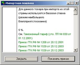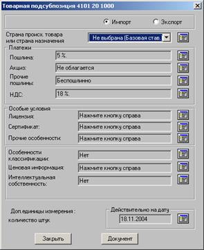Для ускорения поиска можно встать указателем мыши на раскрытый список и нажать первую букву в названии страны. Справа от списка Вы видите кнопку, нажав на которую Вы получите краткую информацию по стране (является ли она страной СНГ, развивающейся страной и т.д.). В середине окна справки в отдельных окошках указаны размеры экспортной и импортной пошлин, акциз, НДС, а также особые условия при экспорте и импорте этого товара.