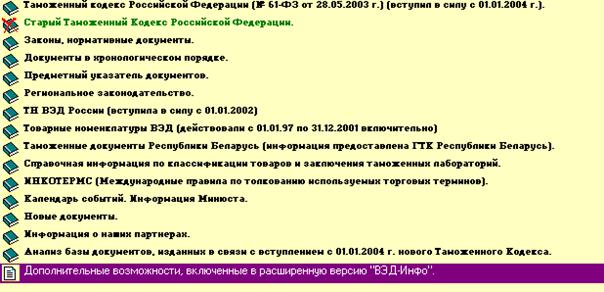 Открыв программу "ВЭД-Инфо", Вы видите экран, в котором указаны основные разделы справочника:
