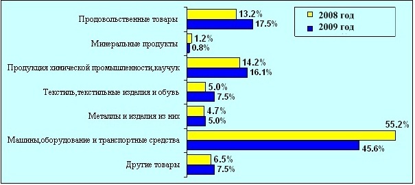 В товарной структуре импорта России из стран дальнего зарубежья в 2009 г. по сравнению 2008 года сократился удельный вес машин, оборудования и транспортных средств, минеральных продуктов, увеличилась доля текстиля, текстильных изделий и обуви, продовольственных товаров и сельскохозяйственного сырья (кроме текстильного), продукции химической промышленности и каучука, металлов и изделий из них и древесины и целлюлозно-бумажных изделий.