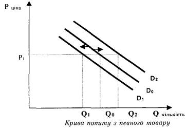 Отже, сукупний попит — це реальний обсяг продукції національного виробництва, який споживачі готові придбати за певного рівня цін. Тобто існує прямо пропорційна залежність між обсягом продукції та її ціною відповідно до закону попиту: зростання ціни неодмінно приводить до спаду обсягів попиту. Варто наголосити, що при розгляді закону попиту припускається, що ціна впливає на обсяг попиту «за інших однакових умов». Зміна попиту означає, що за кожної ціни споживачі купуватимуть порівняно більший або менший обсяг товару чи послуг. Графічно це відповідає зміні положення кривої попиту D0 b положення кривої D, або D2 при зміні інших факторів, які впливають на попит. Зміною обсягу попиту прийнято називати зміну величини попиту при зміні ціни на товари чи послуги за решти однакових умов. Графічно це відповідає пересуванню ціни по кривій попиту з однієї точки в іншу, при цьому крива попиту залишається у тому самому положенні.