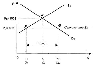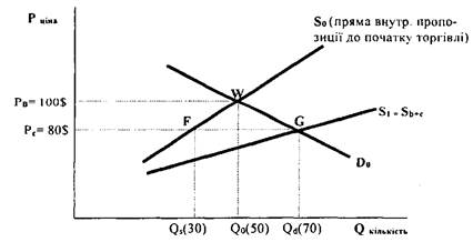 У даній ситуації вплив конкуренції іноземних товарів спрогнозувати — неважко. Внутрішня ціна на товари 100 дол. зменшиться до рівня світової ціни Рг тобто становитиме 80 дол. за одиницю товару. Сукупний попит на товар зросте до 70 одиниць, при цьому національні виробники скоротять своє виробництво з 50 одиниць, які вироблялись в умовах автаркії, до 30 одиниць.
