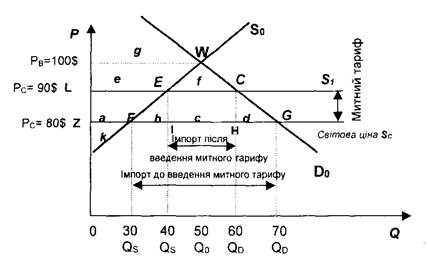 Як і в першому випадку, дана ситуація зумовить вкрай негативну реакцію з боку національних виробників, які усіма способами будуть лобіювати введення імпортного мита на іноземні товари. Спробуємо спрогнозувати наслідки введення митного тарифу на економіку великої країни за допомогою графіка.