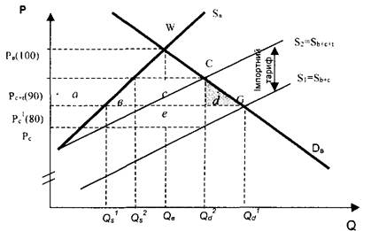 Після введення митного тарифу на ринку встановлюється нова рівновага, якій на графіку відповідає т.С. Наслідком цього стане збільшення національного виробництва з QJ до Сд.2 , а також скорочення внутрішнього споживання з Qd ' до Qd 2 . Існуюча різниця між внутрішнім споживанням і внутрішньою пропозицією задовольнятиметься за рахунок імпорту, який також скоротиться з величини Сд' - Q,2 до, — це втрати в результаті зменшення економічної ефективності національного виробництва порівняно із закордонними, а ефект споживання — втрати в результаті скорочення внутрішнього споживання. Ефект перерозподілу представлено сегментом а і означає перерозподіл доходів від споживачів до національних виробників конкуруючої з імпортом продукції.