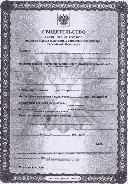 Форма Справки на вывоз предметов культурного назначения с территории РФ.