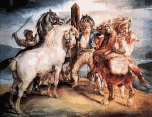 В луврском “Рынке” Жерико запечатлел с натуры пять огненных берберийских лошадей: они лягаются, бьют копытом, кусаются, в то время как конюх и два его помощника пытаются их успокоить и привязать к столбу. Эта прекрасная акварель демонстрирует одну из излюбленных тем молодого романтического мастера-тему человека, укрощающего животное Покой не обладал для Жерико достаточной экспрессией: ему нужна была драма, столкновения, выявляющие выразительность жестов конюхов и движений животных. Вот почему художник усилил сангинный рисунок пятнами акварели, которые рождают контрасты теней и света. Люди и животные приобретают поразительную рельефность, их фигуры моделируются своего рода круглящимися буграми Более того, Жерико не боялся подчеркивать контурными линиями запутанные формы своей композиции, особенно напряженные от усилий мускулы конюхов Это напряжение акцентирует экспрессию формы Акварельный рисунок становится движущейся архитектурой