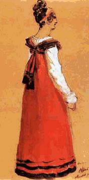 Одновременно с многочисленными этюдами для “Бега свободных лошадей” Жерико фиксировал живописные картины обыденной жизни. Так, в частности, он сделал несколько акварельных зарисовок итальянских дам, следивших за скачками с тем “страстным” вниманием, о котором столько писал Стендаль. Он запечатлел также силуэты прогуливающихся красавиц и среди прочих “Молодую женщину в красном”, которую мы воспроизводим. Платью этой щеголихи 1817 года с его пышными рукавами и большим бантом на спине свойственны красота античного пеплума и цельность скульптурной формы.