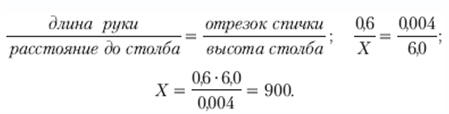 Допустим, надо определить расстояние до телеграфного столба. Направляем на него спичку в вытянутой руке (рис. 6.27), длина которой у взрослого человека равна приблизительно 60 см. На спичке изображение столба заняло два деления, то есть 4 мм. На этих данных нетрудно составить такую пропорцию: