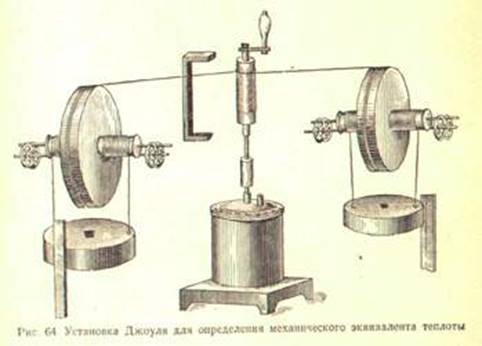 В дальнейшем Джоуль вновь возвращался к экспериментальному определению механического эквивалента теплоты. В 1849 г. он проделал известный опыт по измерению механического эквивалента теплоты. С помощью падающих грузов он заставлял ось с лопастями вращаться внутри калориметра, наполненного жидкостью (рис. 64). Измеряя совершенную грузами работу и выделенную в калориметре теплоту, Джоуль получил механический эквивалент теплоты, равный 424 кГм/ккал.