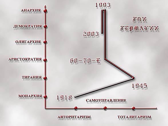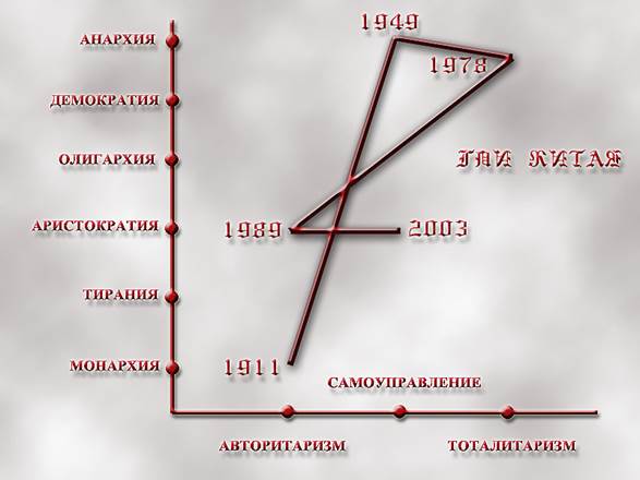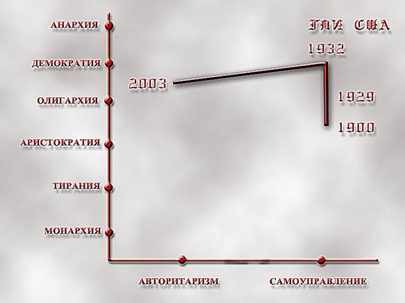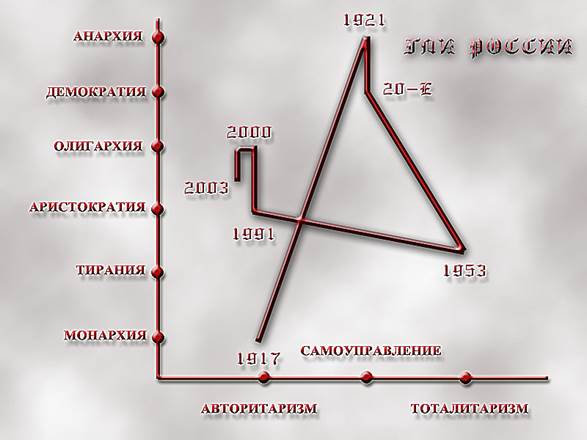 4. Исследовав политическую историю России, Китая, Германии, Японии и США в XX веке и построив графики политической истории этих государств, я вывел из их сравнения основные закономерности соотношения политических режимов и форм правления, реально существовавших там за последние сто лет, что, на мой взгляд, само по себе представляет несомненный теоретический интерес.