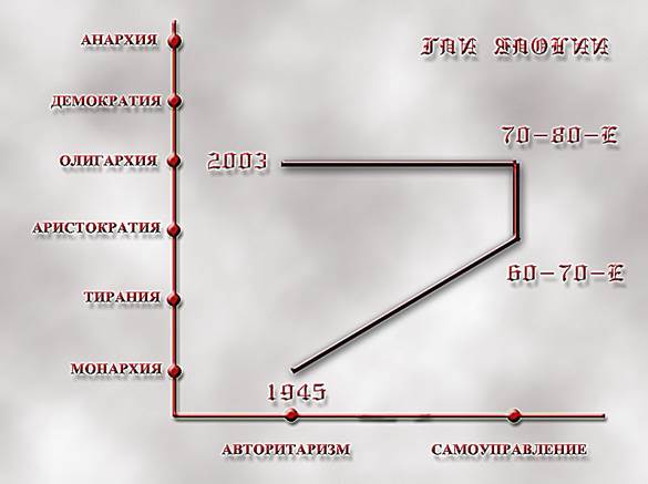 Тимократия и олигархия были историей преодолены (первая — полностью, вторая — частично), а демократический и тоталитарный режимы превратились ныне в господствующие формы. Конечно, их современное истолкование отличается от платоновского. Государствоведческая мысль XX века противопоставляет демократию как политическую форму, обеспечивающую прогресс, тоталитаризму как воплощению политической реакции, тогда как у Платона обе они суть формы вырождения "наилучшего государства". Правда, тирания (платоновский эквивалент современного тоталитарного режима), в этой градации занимает последнее место и потому страдает наибольшей вырожденностью[7] .