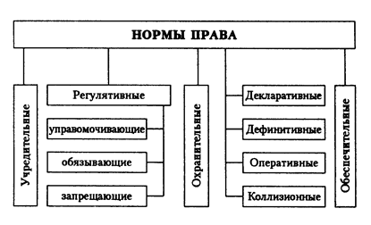 2. По социальному назначению и роли в правовой системе нормы можно подразделить: на учредительные (нормы-принципы), регулятивные (нормы — правила поведения), охранительные (нормы — стражи порядка), обеспечительные (нормы-гарантии), декларативные (нормы-объявления), дефинитивные (нормы-определения), коллизионные (нормы-арбитры), оперативные (нормы-инструменты).