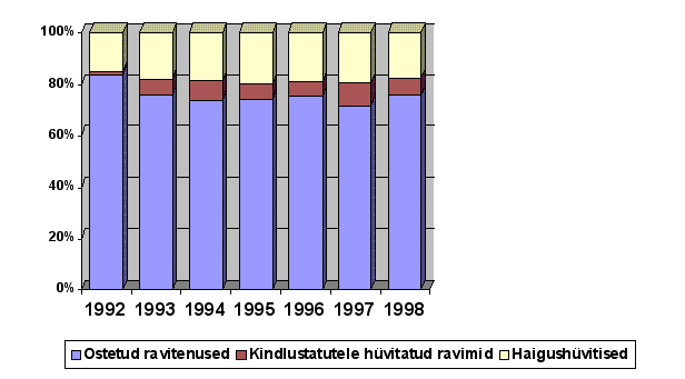 Рост расходов за последние 6 лет можно рассматривать с разных сторон. С одной повышение расходов требует постоянного повышения поступлений от налога на медицинское страхование, а с другой стороны как уже упоминалось возможность покрывать более дорогие расходы приводит к тому что медицинские учреждения могут оказывать более качественные услуги своим пациентам и обеспечивать врачам более высокую компенсацию их труда. Как видно из следующего графика хотя наблюдался рост расходов на медицину однако структурно схема расходов не изменилась.