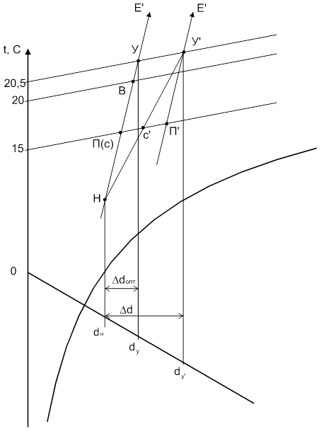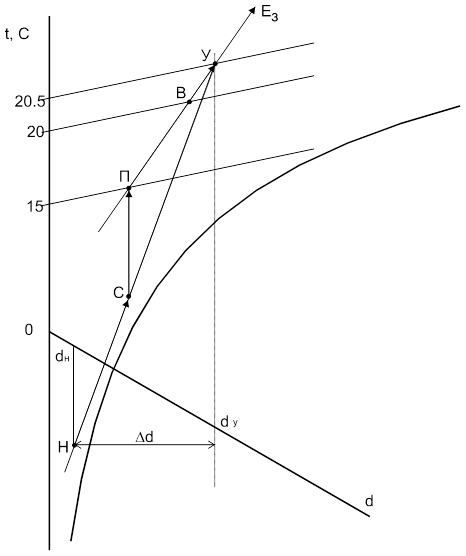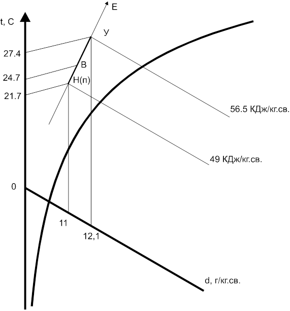 В теплый период года температура притока tп т = tн т (л) , tп т =21,7 °С, tрз =tп т +3°С=24,7 °С