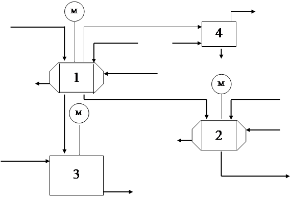 1- реактор полного смешения непрерывного действия; 2 – стабилизатор; 3 – сбросная ёмкость; 4 – ловушка окислов азота.