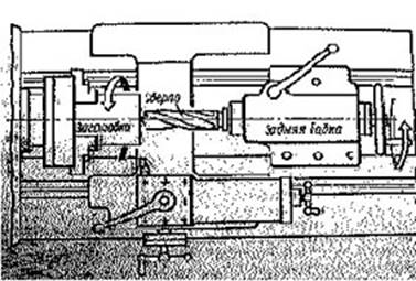 При сверлении на токарном станке сверло, установленное в пиноли задней бабки, подают к детали вручную - вращением маховичка (рис.2).