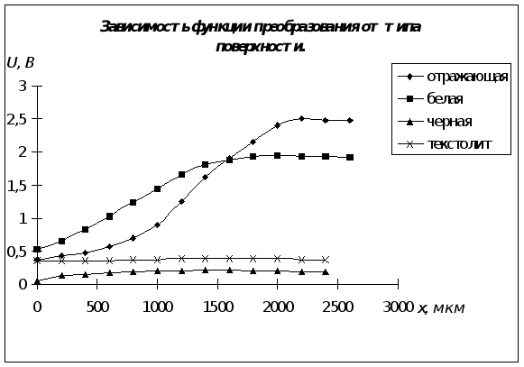 Измерения производятся для четырех типов поверхности: отражающая поверхность, белая бумага, черная бумага и текстолит. Измеряем напряжение на выходе датчика в точках от x=0 до значения, при котором напряжение будет максимальным, с шагом 200 мкм.
