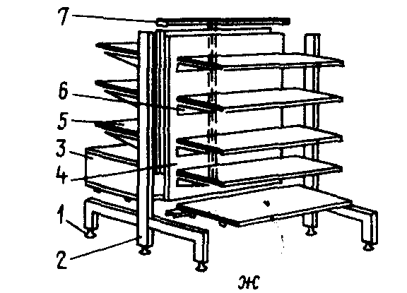 Горки пристенные и островные: а— горка пристенная универсальная; б — горка пристенная для парфюмерии; в — горка пристенная для парфюмерии, галантерей, канцелярских и других товаров; а — горка пристенная для одежды; д — горка островная для обуви; е — горка островная для головных уборов; ж — схема сборки островной горки: 1 — регулируемая опора; S — стойка перфорированная; 3 — подшкафник; 4 — задняя стенка;