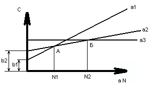 Из графика следует, что прямая а1 пересекает прямую а2 в точке А , которая определяет величину партии, при которой вариант а1 можно экономично использовать. С увеличением годовой программы экономически более эффективным становится вариант а2 .