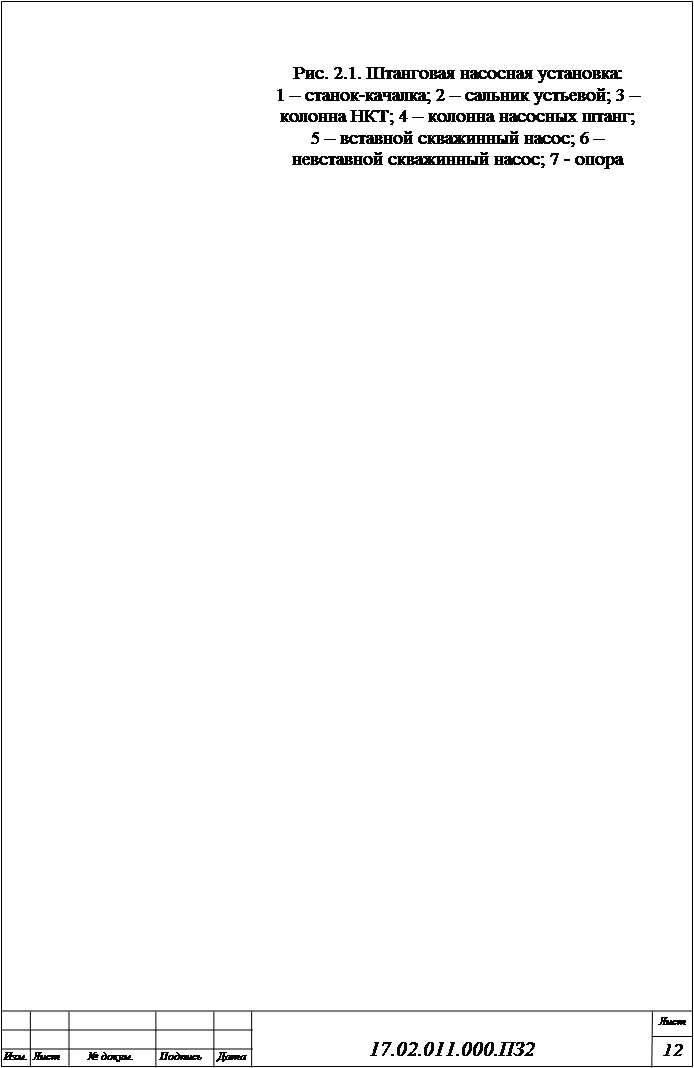 Штанговая насосная установка для эксплуатации одного пласта (рис. 2.1.) состоит из станка-качалки, устьевого сальника, колонны насосных штанг и насосно-компрессорных труб, а также вставного или невставного скважиннного насоса. Для закрепления в колонне насосно-компрессорных труб вставного скважинного насоса, спускаемого на колонне насосных штанг, применяется замковая опора. Цилиндры невставных насосов спускаются в скважину на конце колонны насосно-компрессорных труб, а плунжер – на конце насосных штанг.