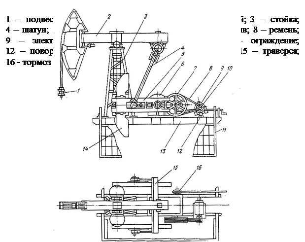 Основные узлы станка-качалки – рама, стойка в виде усеченной четырехгранной пирамиды, балансир с поворотной головкой, траверса с шатунами, шарнирно подвешенная к балансиру, редуктор с кривошипами и противовесами. Комплектуется набором сменных шкивов для изменения числа качаний. Для быстрой смены и натяжения ремней электродвигатель устанавливается на поворотной салазке.
