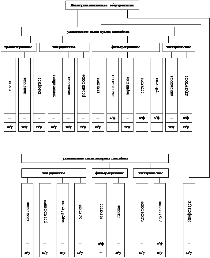 Классификация пылеулавливающего оборудования согласно ГОСТ 12.2.043-80 приведена на схеме. На схеме дополнительно показан вид пылеулавливающего оборудования – биофильтр, применяемый для очистки выбросов, от ряда органических пылей.