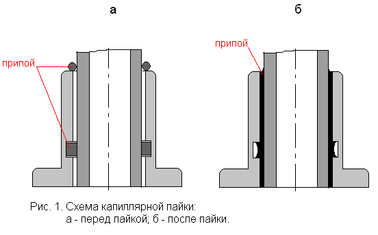 Капиллярная пайка. Припой заполняет зазор между соединяемыми поверхностями и удерживается в нем за счет капиллярных сил. На рис.1 показана схема образования шва. Соединение образуется за счет растворения основы в жидком припое и последующей кристаллизации раствора. Капиллярную пайку используют в тех случаях, когда применяют соединение внахлестку. Однако капиллярное явление присуще всем видам пайки.