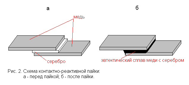 Контактно-реактивная пайка . При пайке между соединяемыми металлами или соединяемыми металлами и прослойкой другого металла в результате контактного плавления образуется сплав, который заполняет зазор и при кристаллизации образует паяное соединение. На рис.2 показана схема контактно-реактивной пайки.